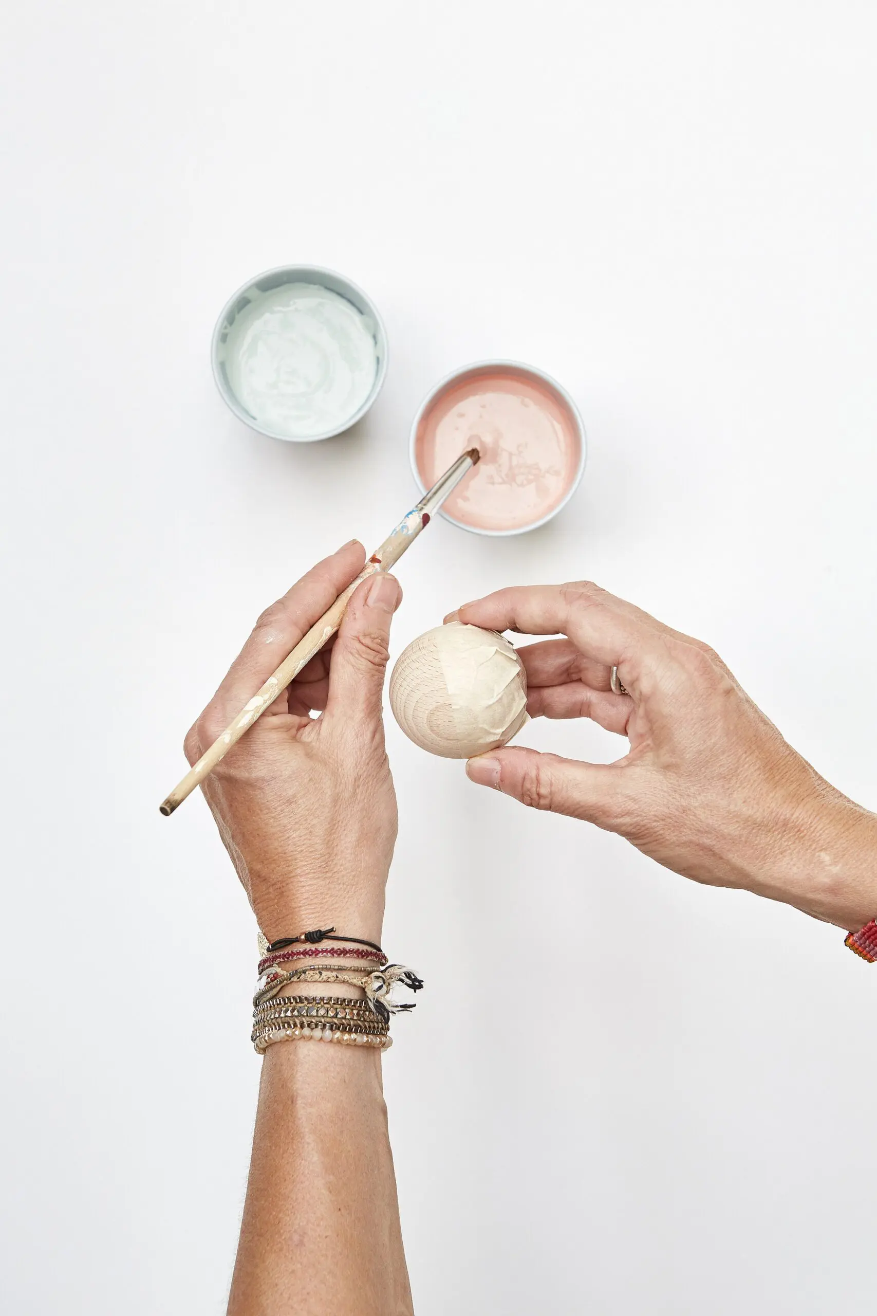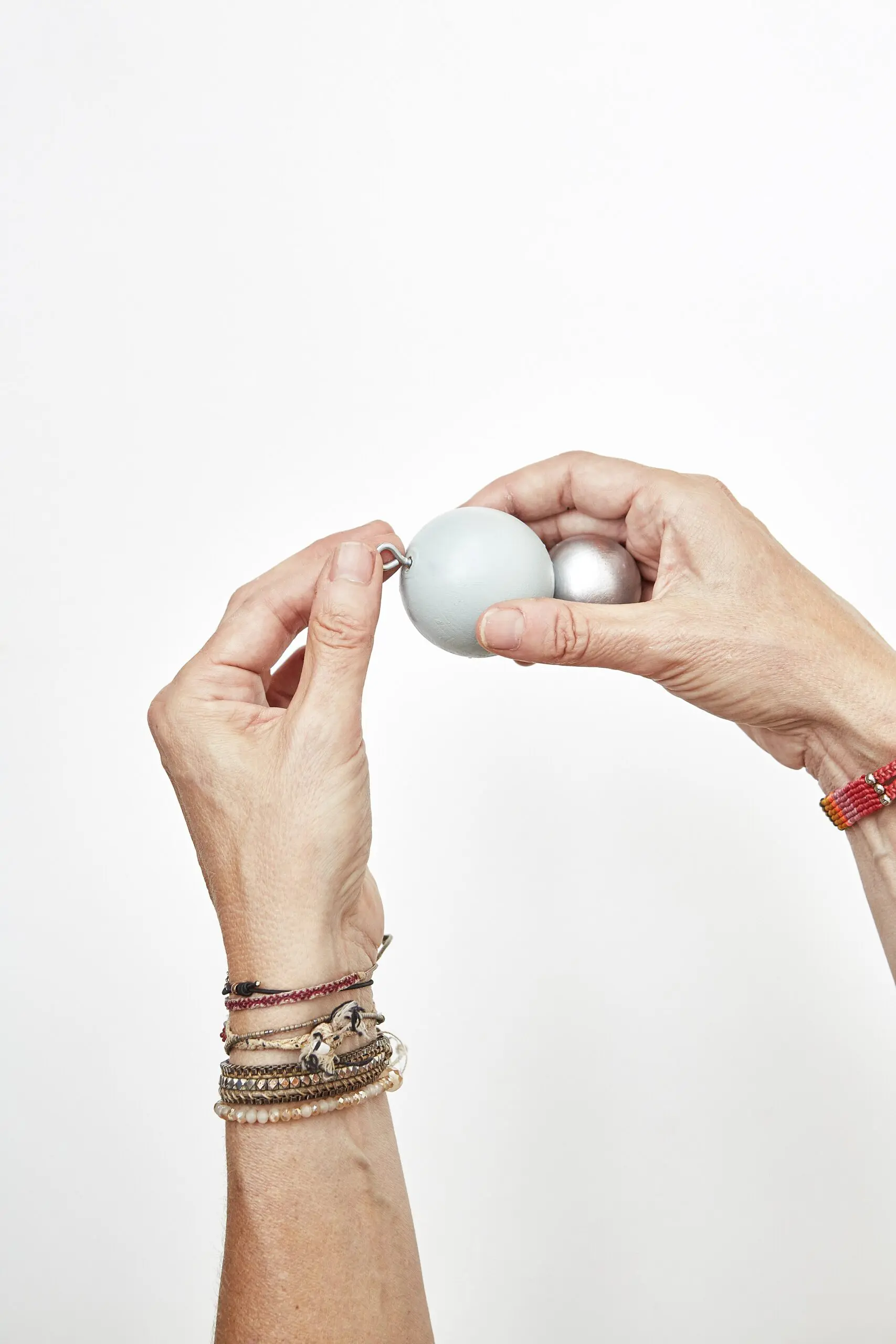 Kuličky navrtáme nebozízkem, aby se nám lépe natíraly. Pokud chceme vytvořit efekt pruhu, nebo kuličky natřené na půl, oblepíme kuličky vodorovně kolem dokola maskovací páskou, poté natíráme nebo sprejujeme. Jakmile kuličky uschnou, můžeme nakombinovat různé velikosti a poskládat vánoční ozdoby. Jednotlivé kuličky k sobě slepíme. Abychom mohli ozdoby pověsit, do horní kuličky navrtáme očko s vrutem, provlékneme provázkem a zavěsíme.