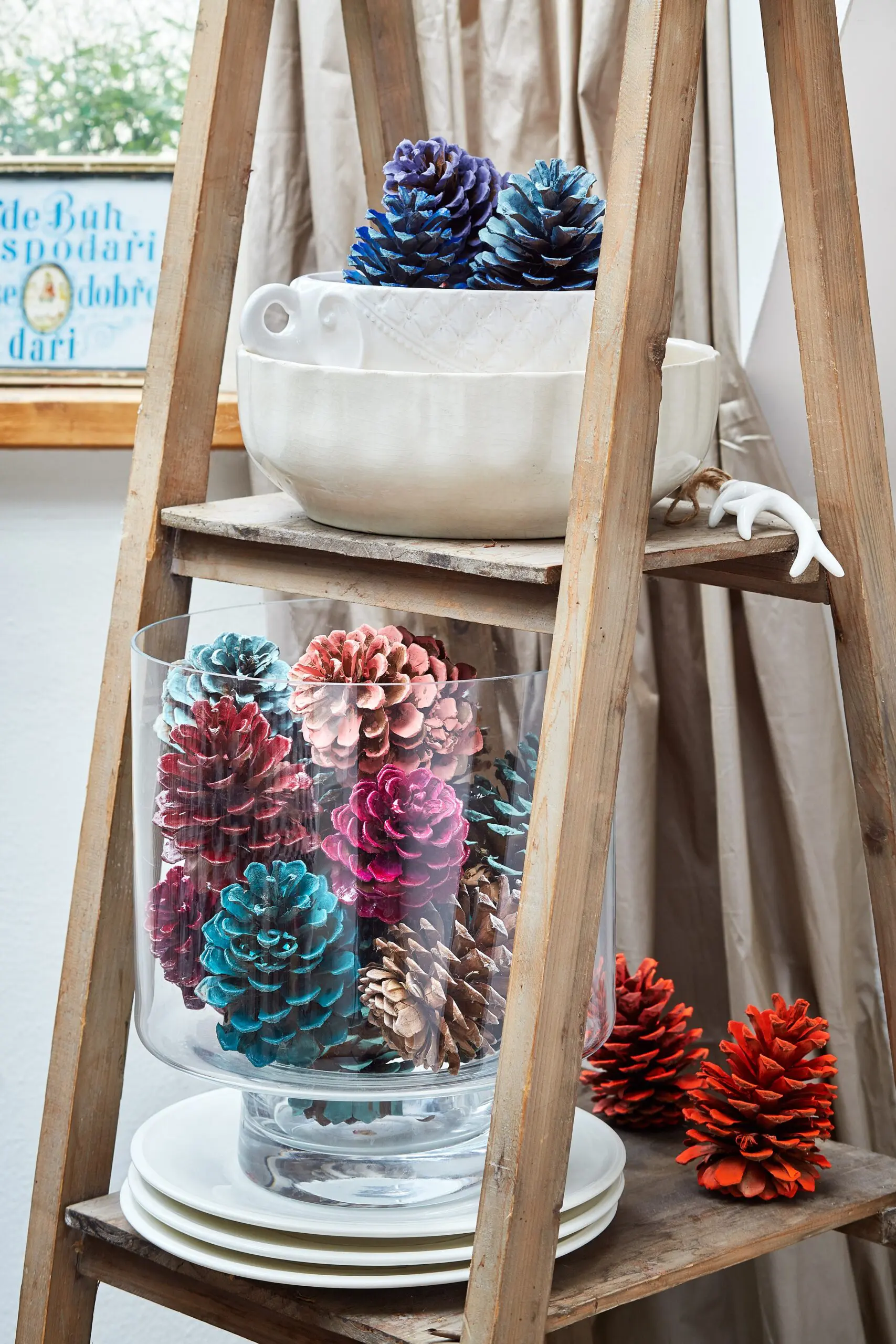 Budeme potřebovat: ideálně borovicové šišky, štětec, barvu Primalex Inspiro (my jsme použili následující barvy: lososová, oranžová, vínová, tyrkysová a modrá)