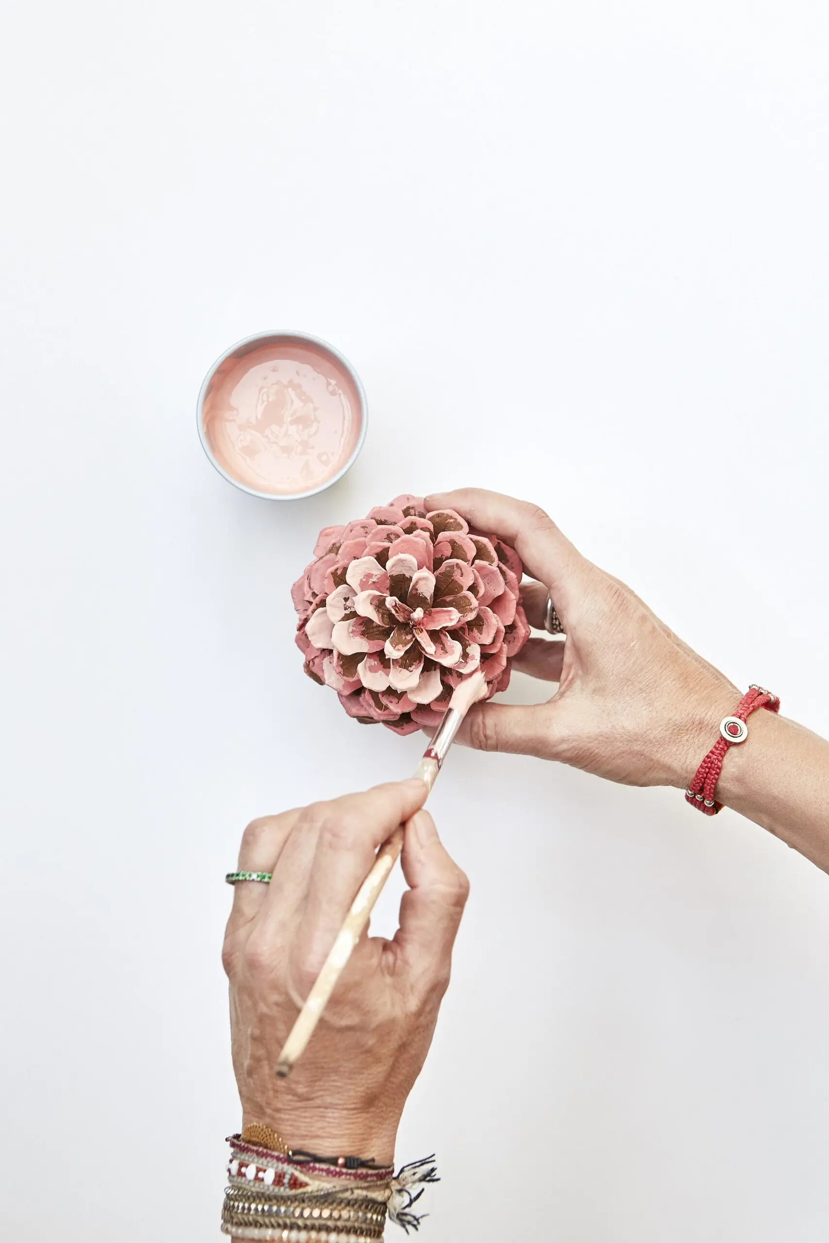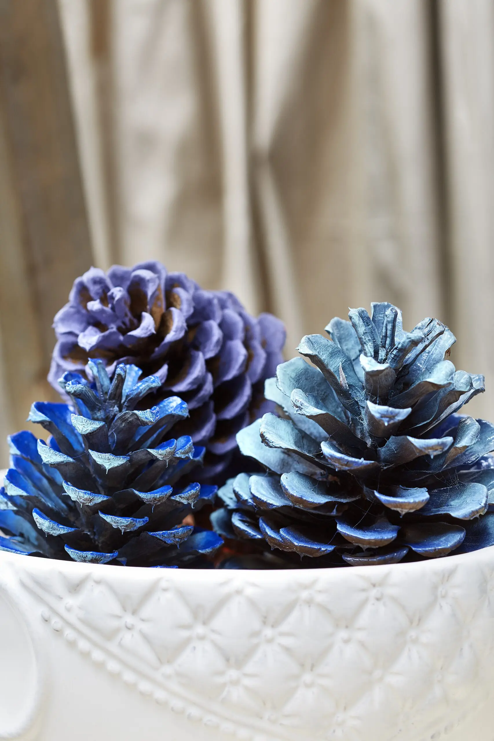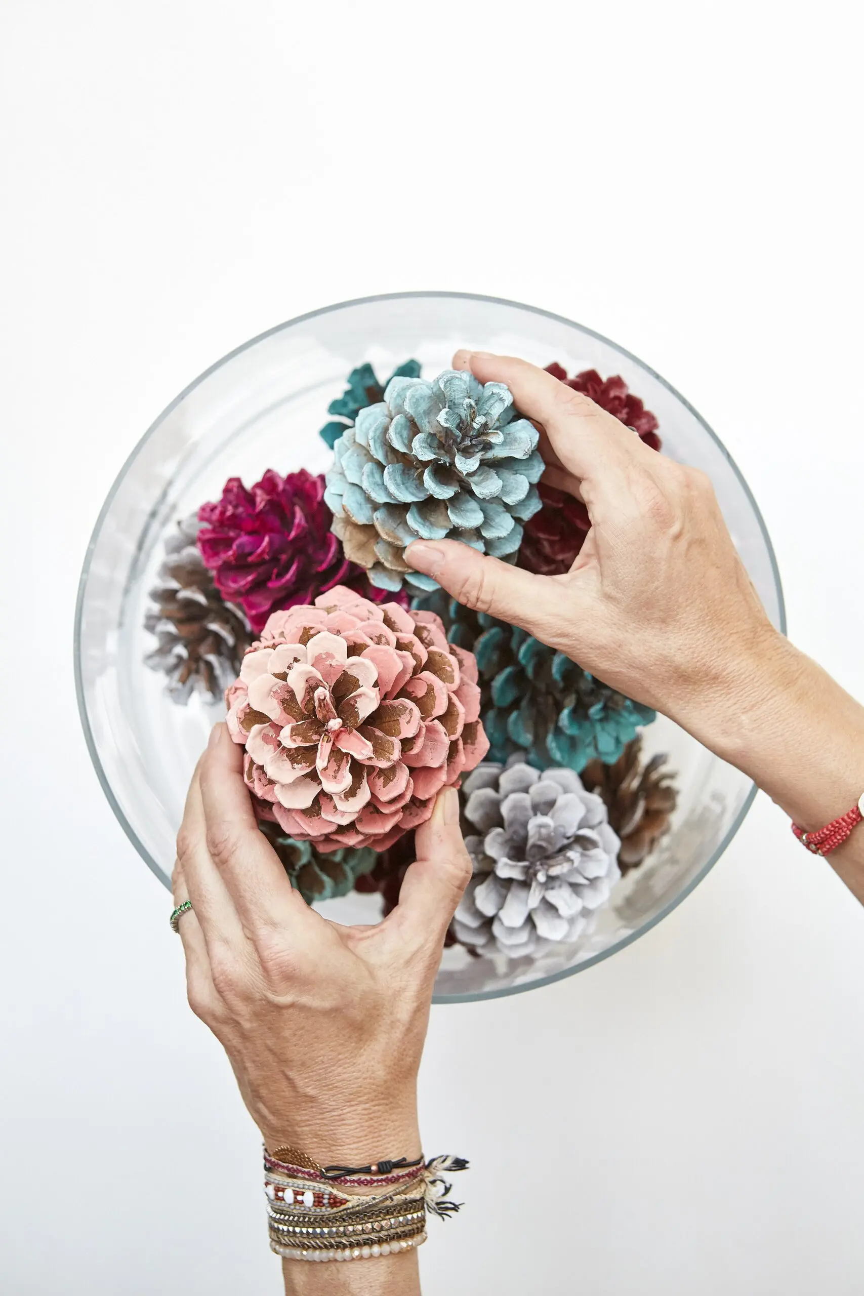 Šišky natíráme štětcem v několika odstínech, buď pouze po okrajích, nebo důkladněji po celé ploše. Tím získáme patinovaný efekt. Na jednu šišku můžeme použít i dva odstíny, dosáhnete tak plastičtějšího efektu. Natřené šišky nasypeme jako dekoraci do velké mísy, nebo skleněné vázy.
