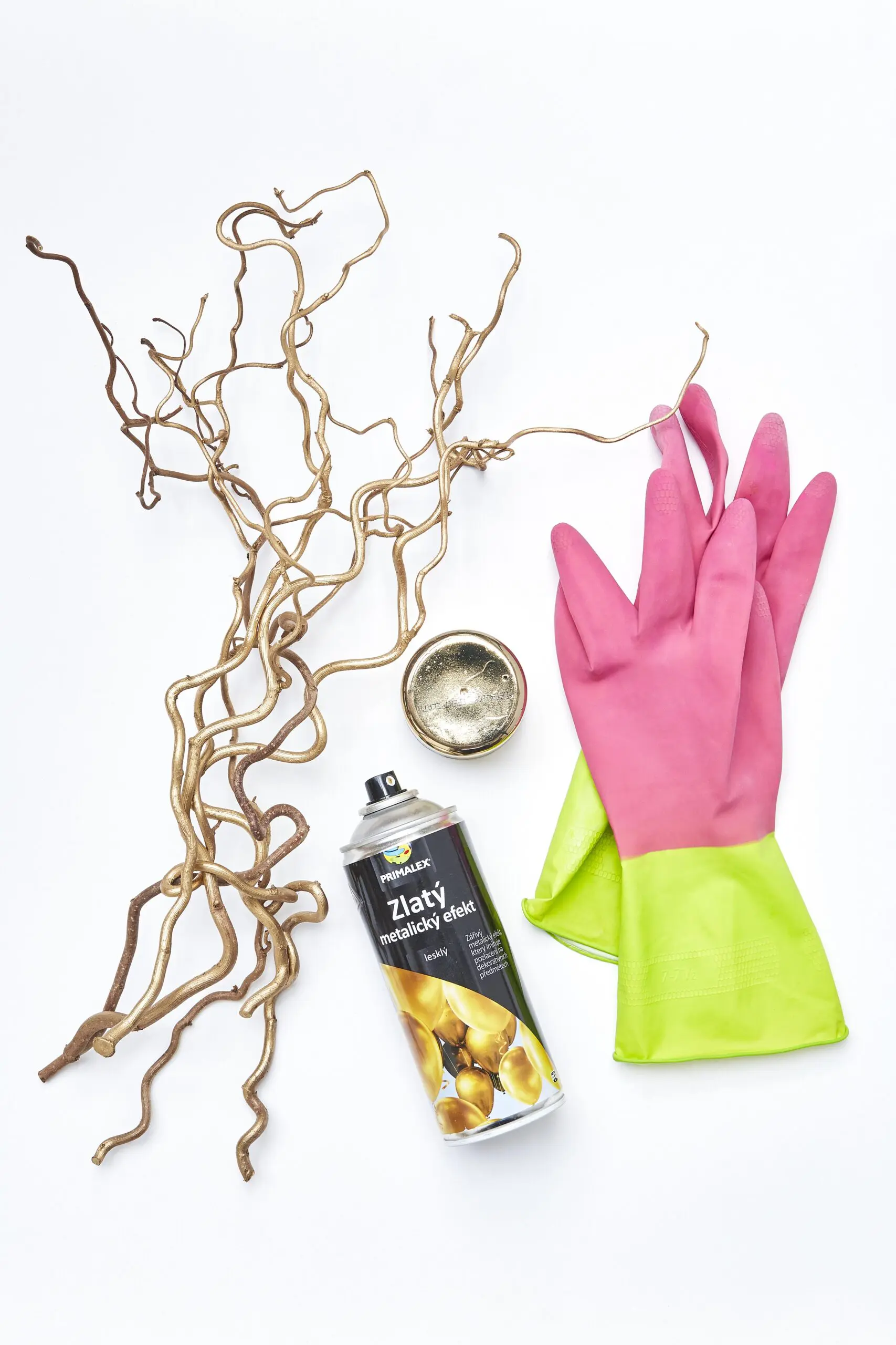 Budeme potřebovat: holé větvičky, mohou být i kroucené vrbové větvičky nebo jiné dekorativní sušené kořínky apod. (v přírodě nebo z floristických potřeb), sprej Primalex se zlatým efektem