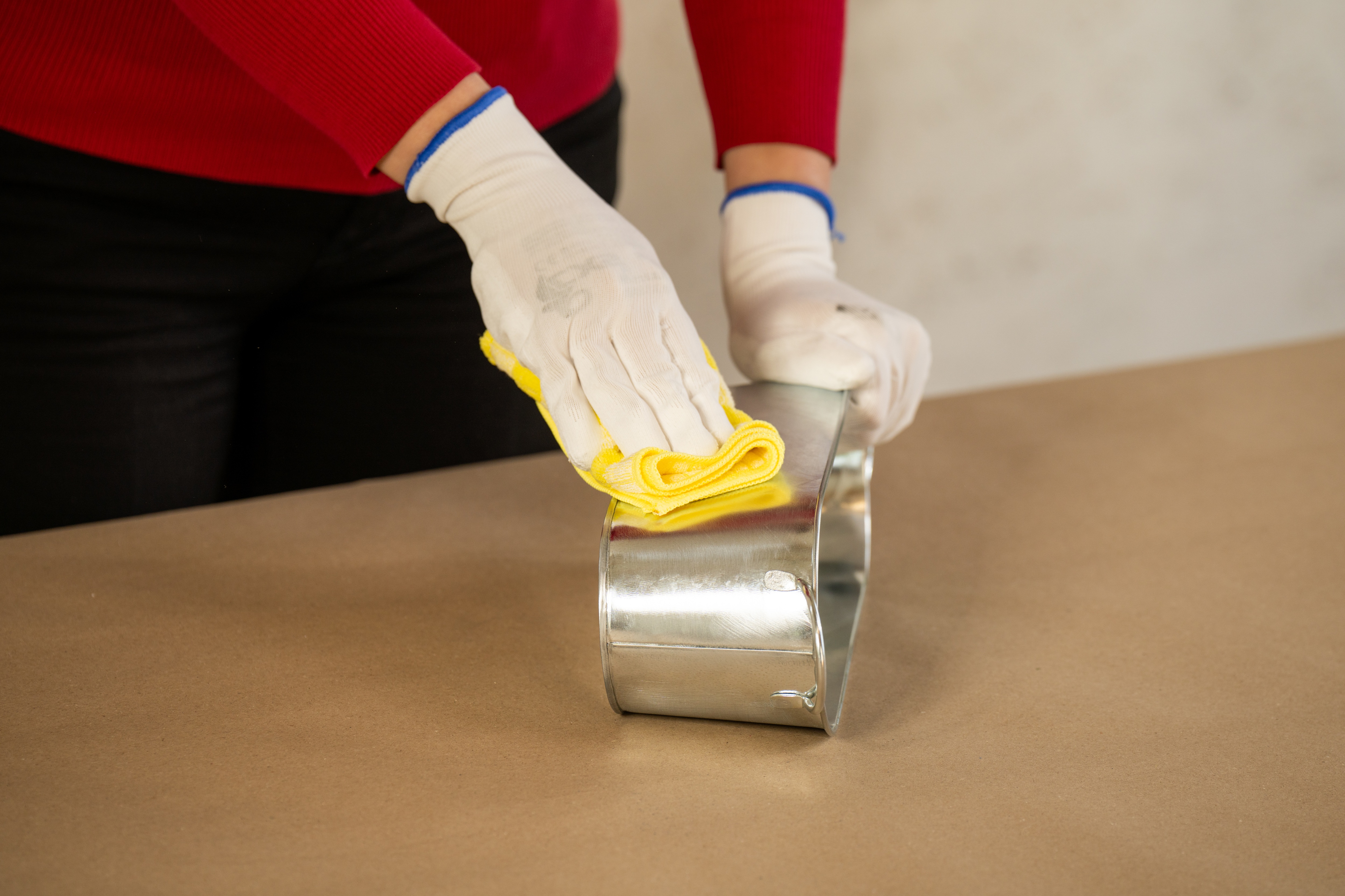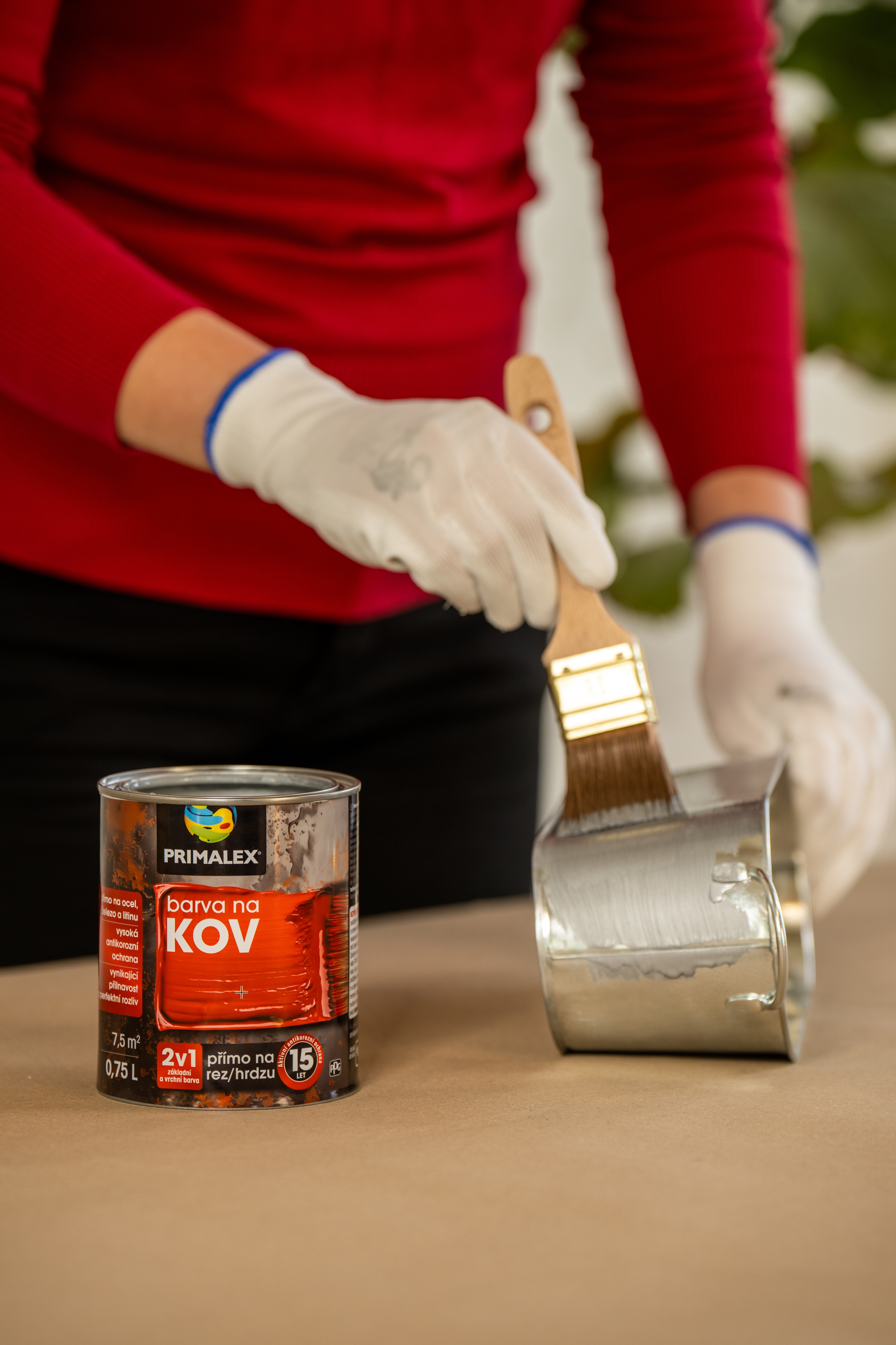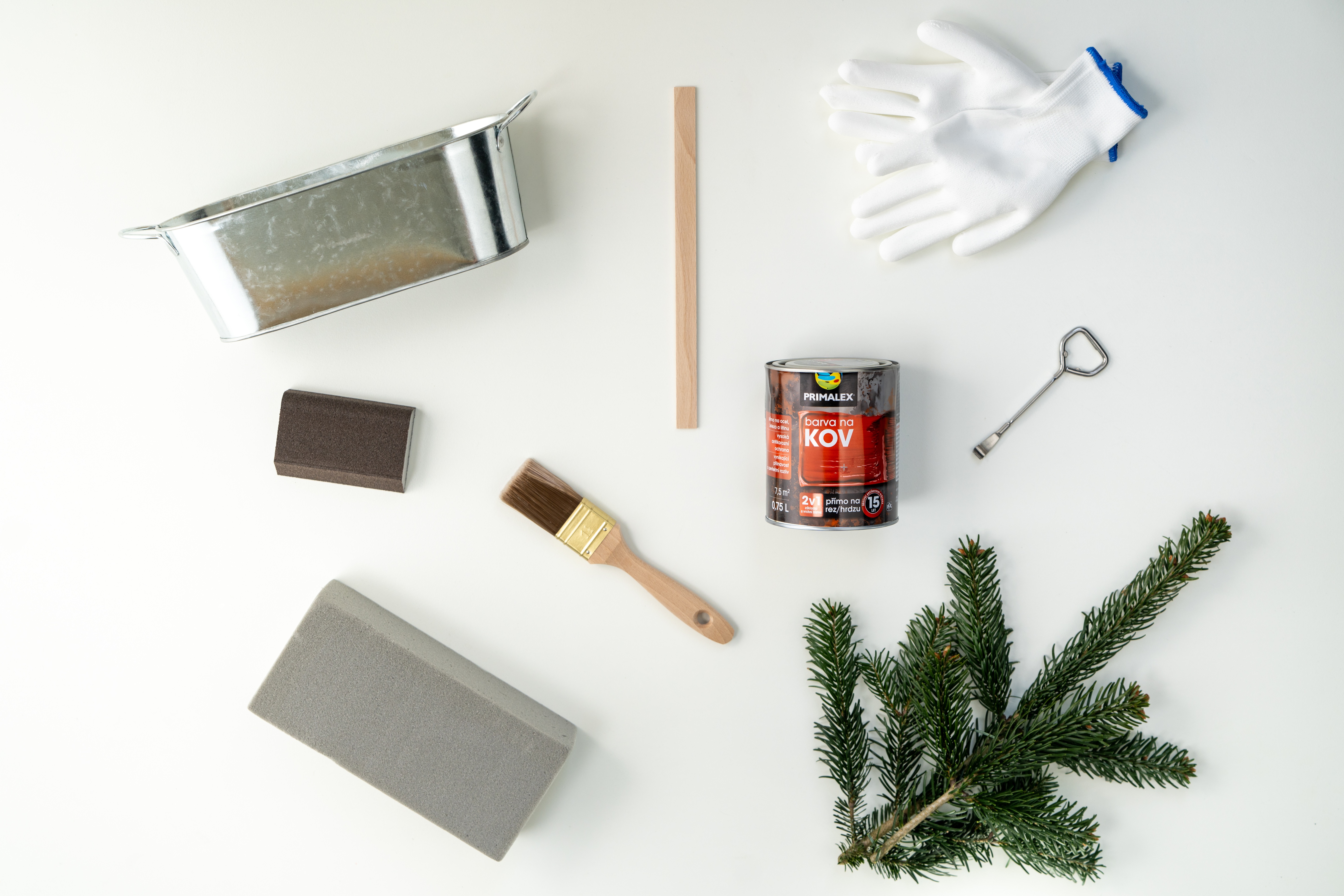 V první řadě se zaměřte na vzhled samotných truhlíků. Pokud už se na nich podepsala léta používání nebo se místy dokonce objevila rez, nezoufejte! Stačí, když jim dopřejete nový ochranný nátěr. Primalex Barva na kov 2v1 díky vysoké antikorozní ochraně prodlouží životnost kovových povrchů. Lze ji aplikovat přímo na rez bez použití základní barvy. Dále si připravte aranžovací hmotu, přírodniny (např. jehličnaté větve, borůvčí, šípky, mech či šišky), plochý štětec (vel. 1,5“), jemnou brusnou houbu a ochranné rukavice.