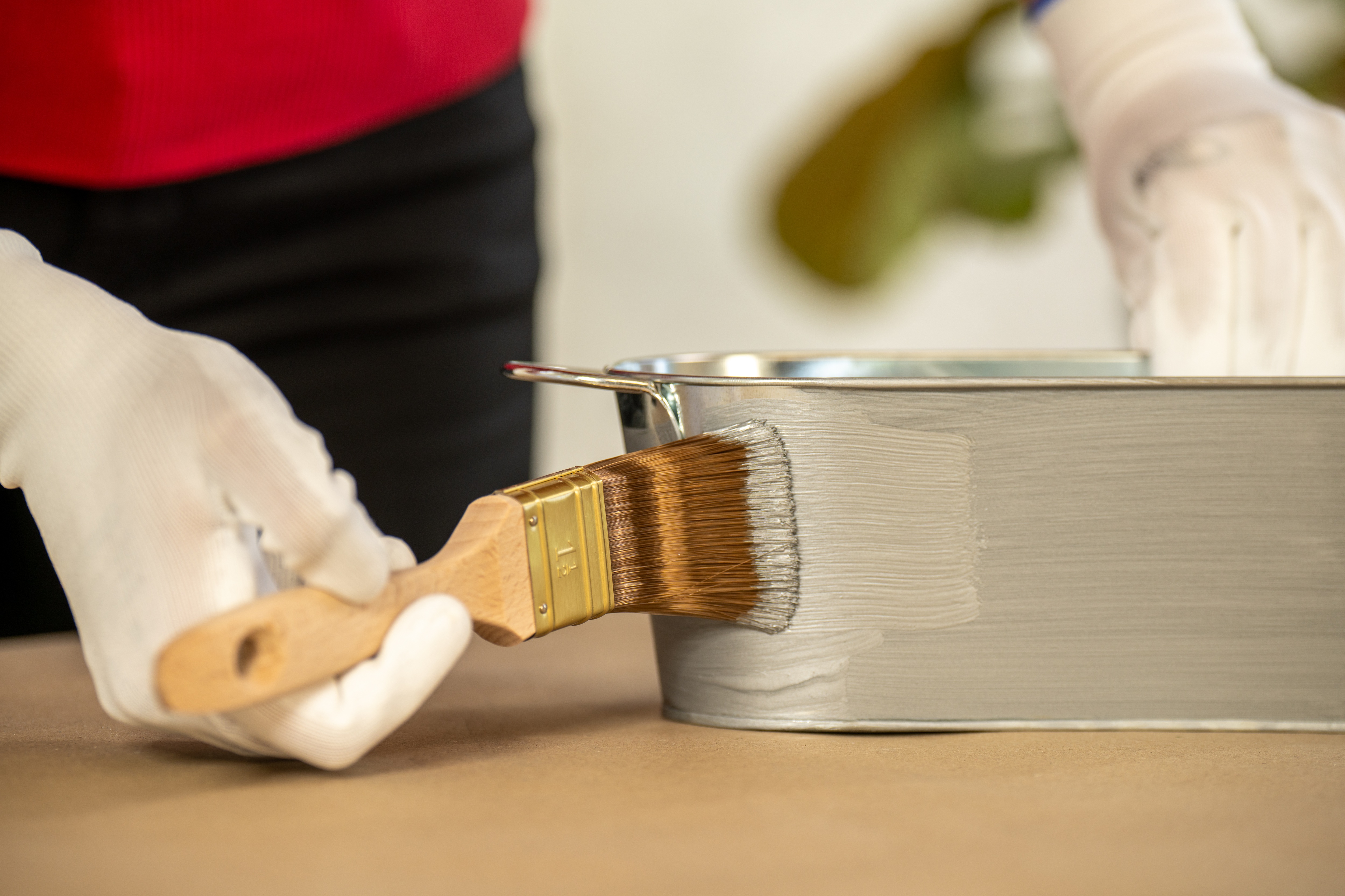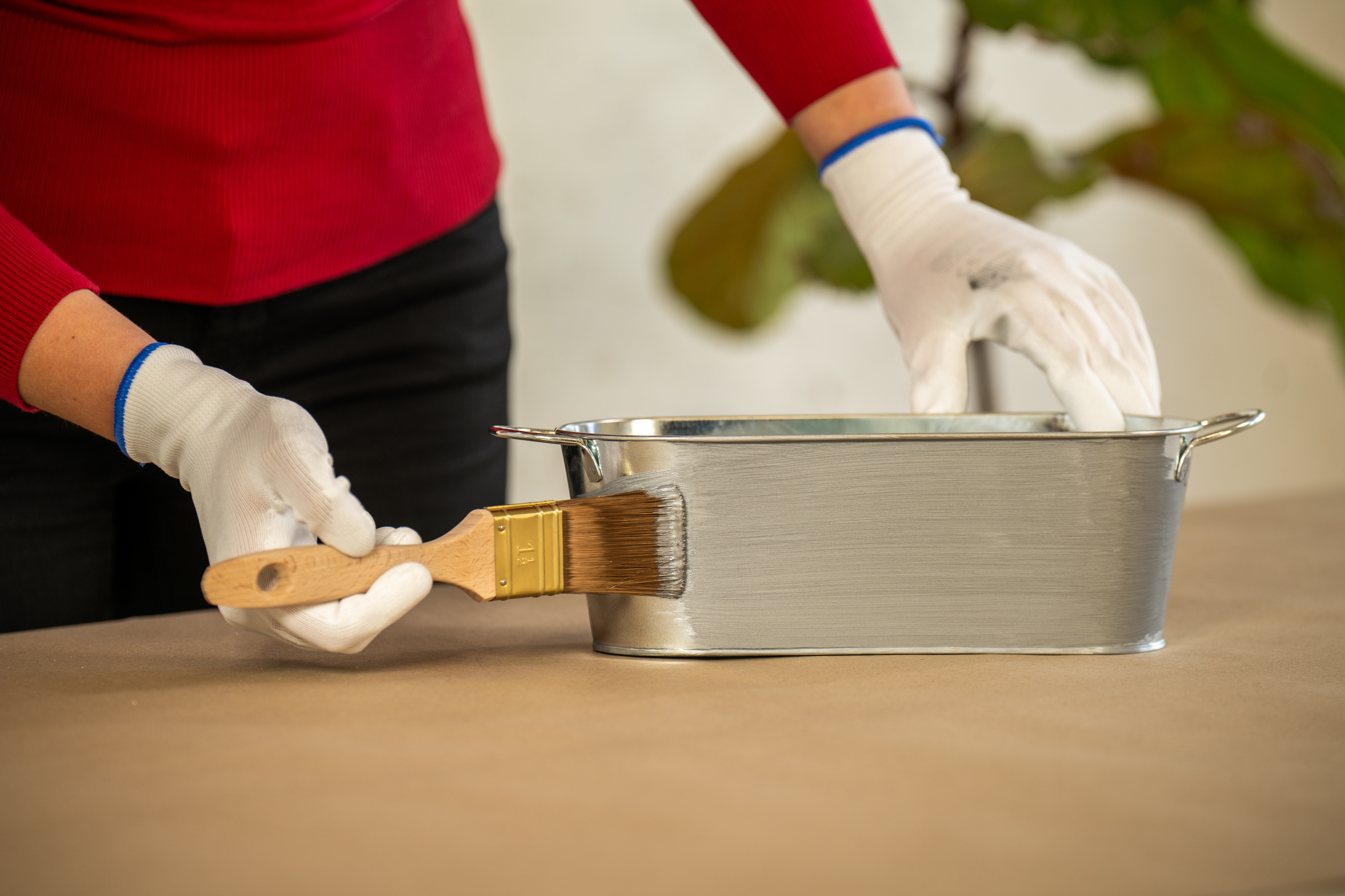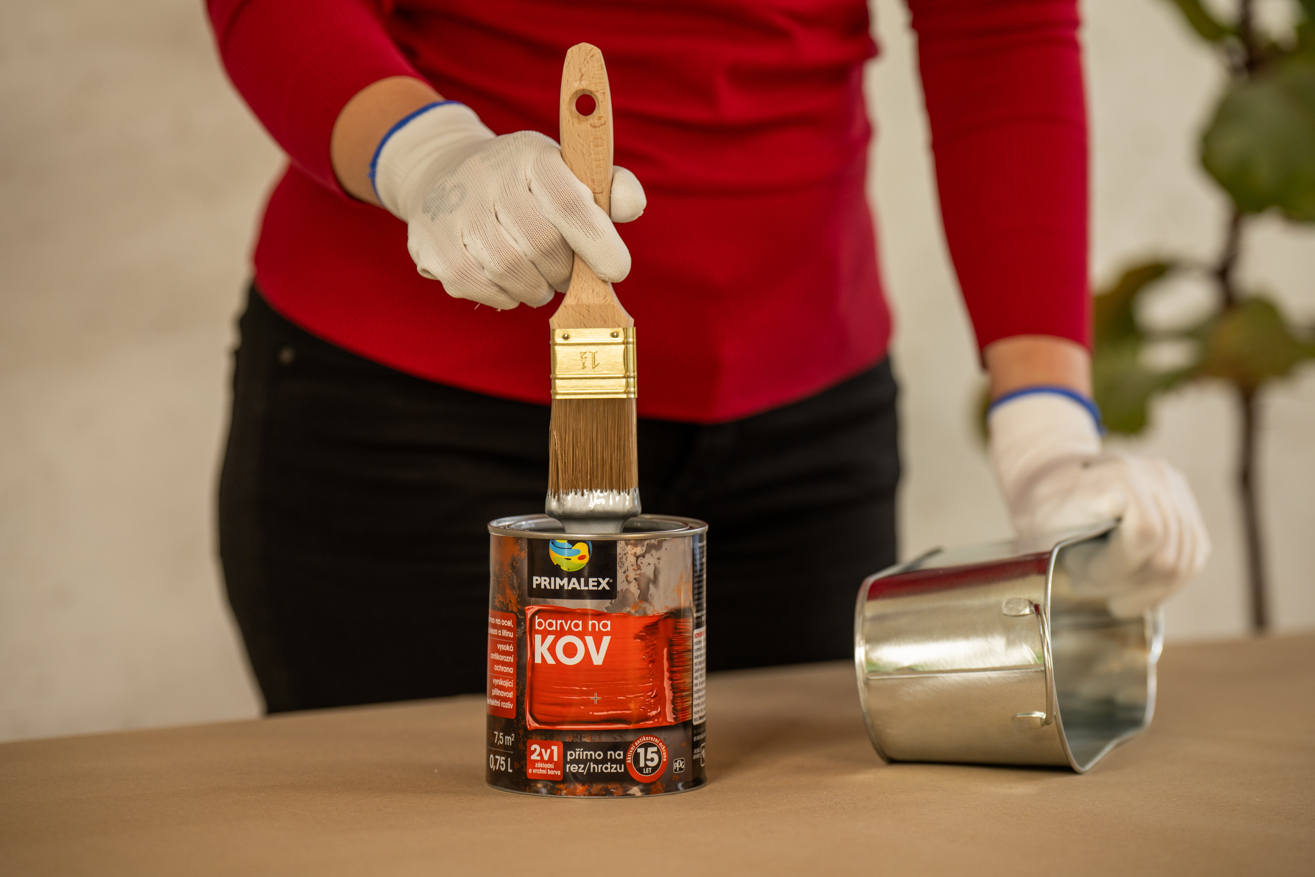 S výhledem na vyzdobené truhlíky bude i to nejchmurnější počasí působit o něco pozitivněji. Začněte novým nátěrem. Kovový truhlík jemně zbruste a následně otřete hadříkem od prachu, mastnoty a dalších nečistot. Povrch musí být také zbaven všech starých a odlupujících se nátěrů. Barvu na kov před použitím i během aplikace důkladně promíchejte, aby na dně nezůstávala usazenina. Nanášejte ji plochým štětcem ve 2–⁠⁠⁠⁠⁠⁠3 vrstvách, mezi kterými nechte odstup asi 24 hodin. Nátěr na podklad krásně přilne a díky výbornému rozlivu zajistí dokonale hladký finální vzhled.