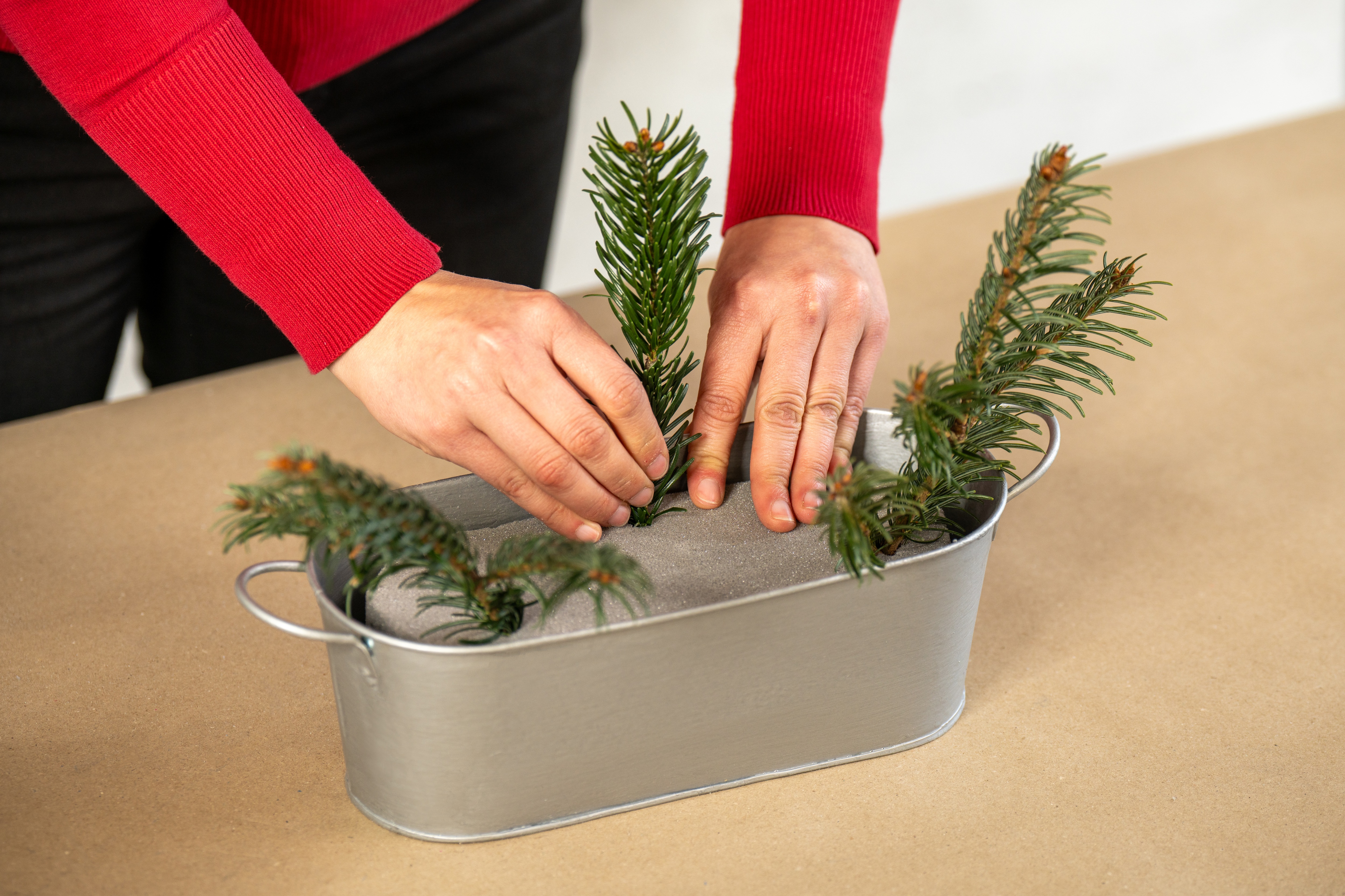 Jakmile poslední vrstva nátěru zaschne, můžete svou pozornost přesunout k samotnému dekorování. Aranžovací hmotu seřízněte do požadované velikosti a vložte ji do truhlíku tak, aby vyplnila celý jeho prostor. Následně do hmoty zapíchejte připravené přírodniny. Skvěle budou vypadat jak různé druhy jehličnatých větví (např. smrkové, cedrové, borovicové, jedlové), tak například větvičky borůvčí. Aranžovací hmotu pomohou dokonale zakrýt mechy nebo lišejníky.