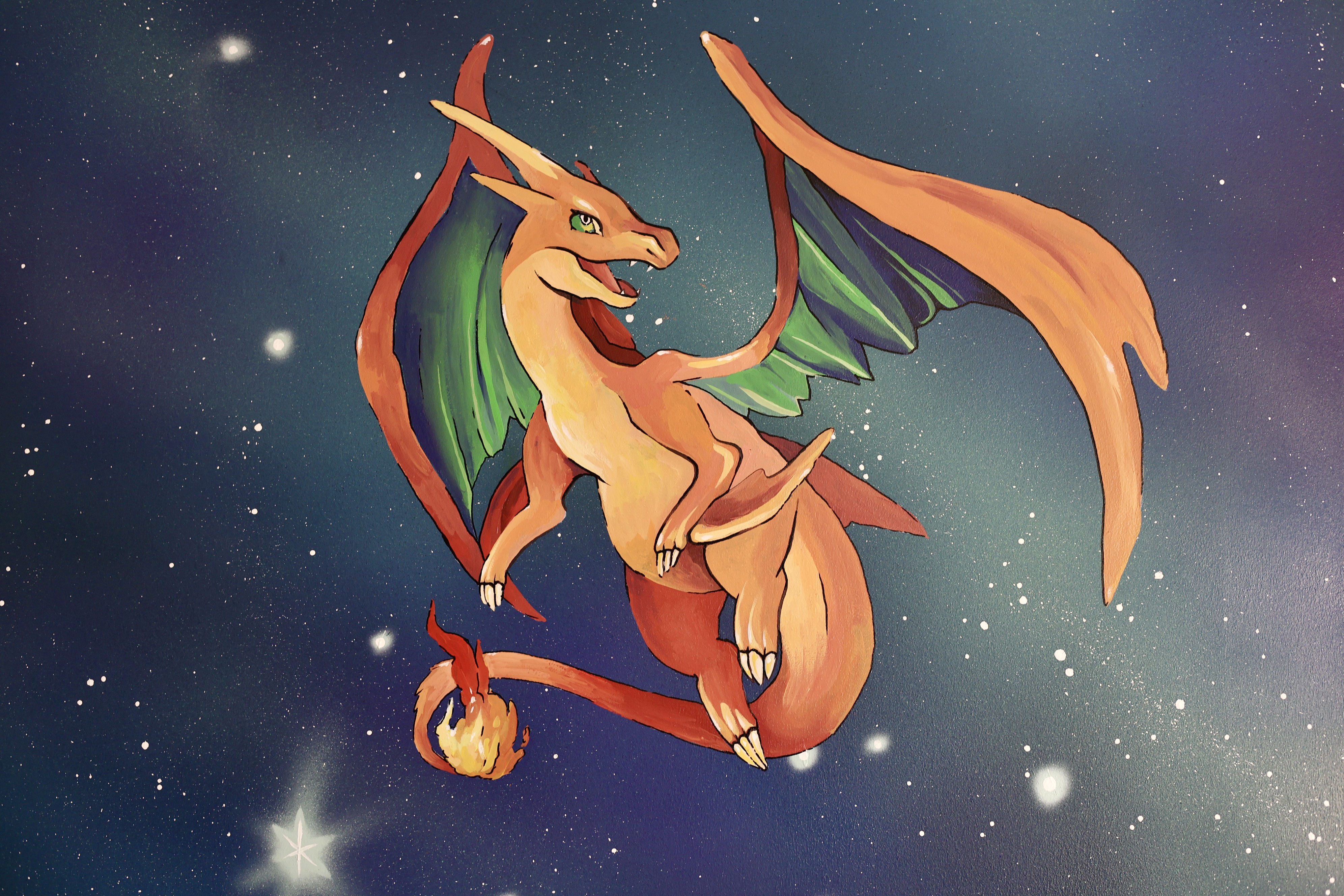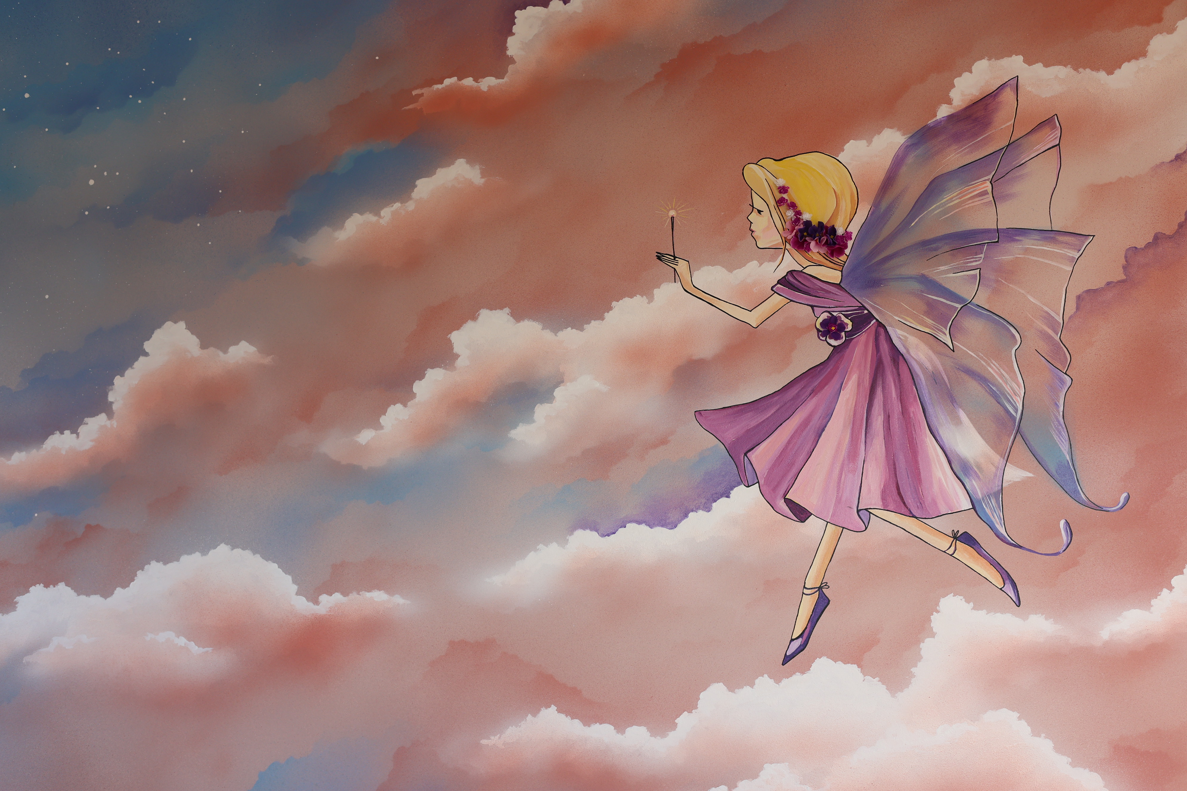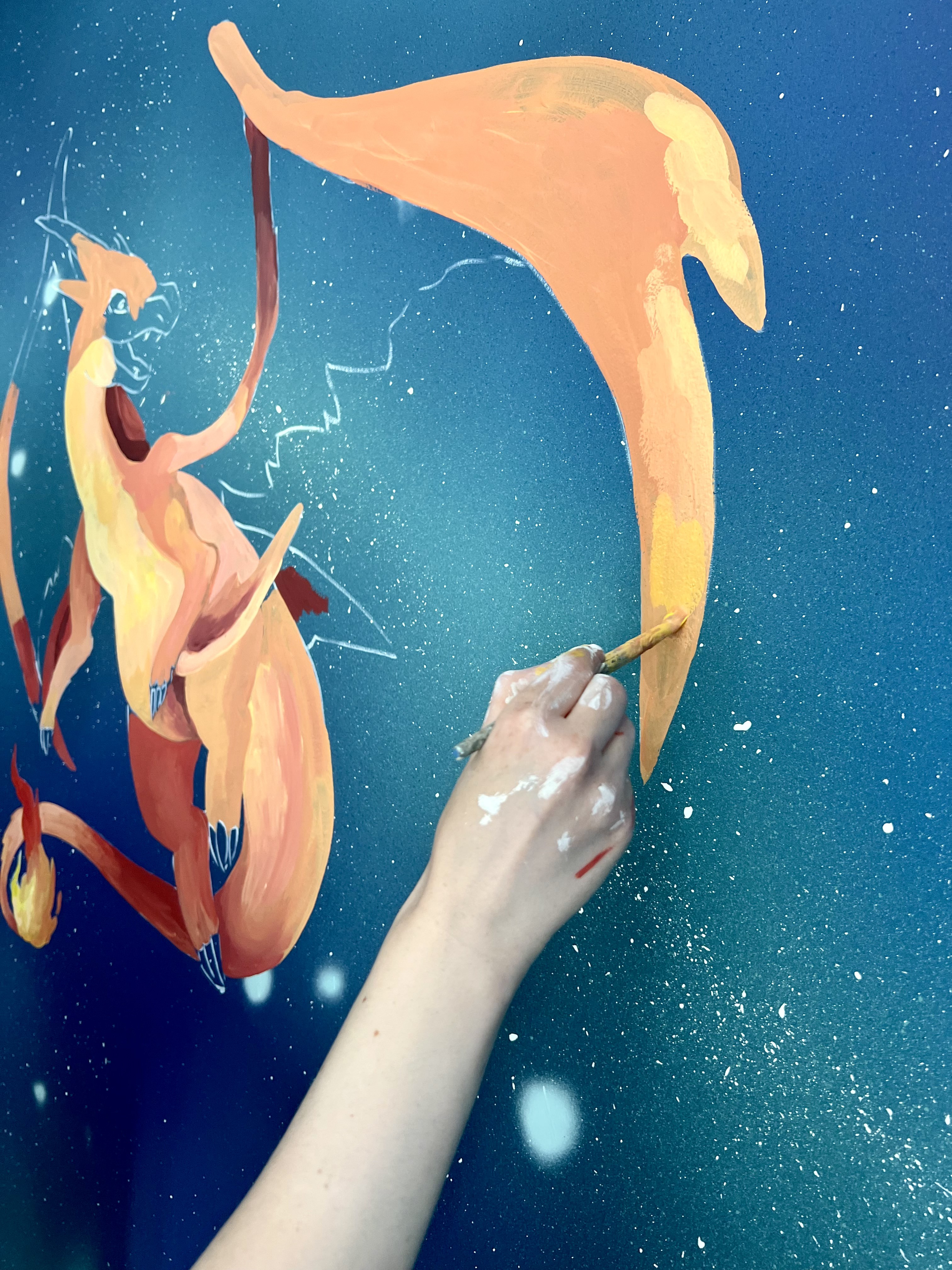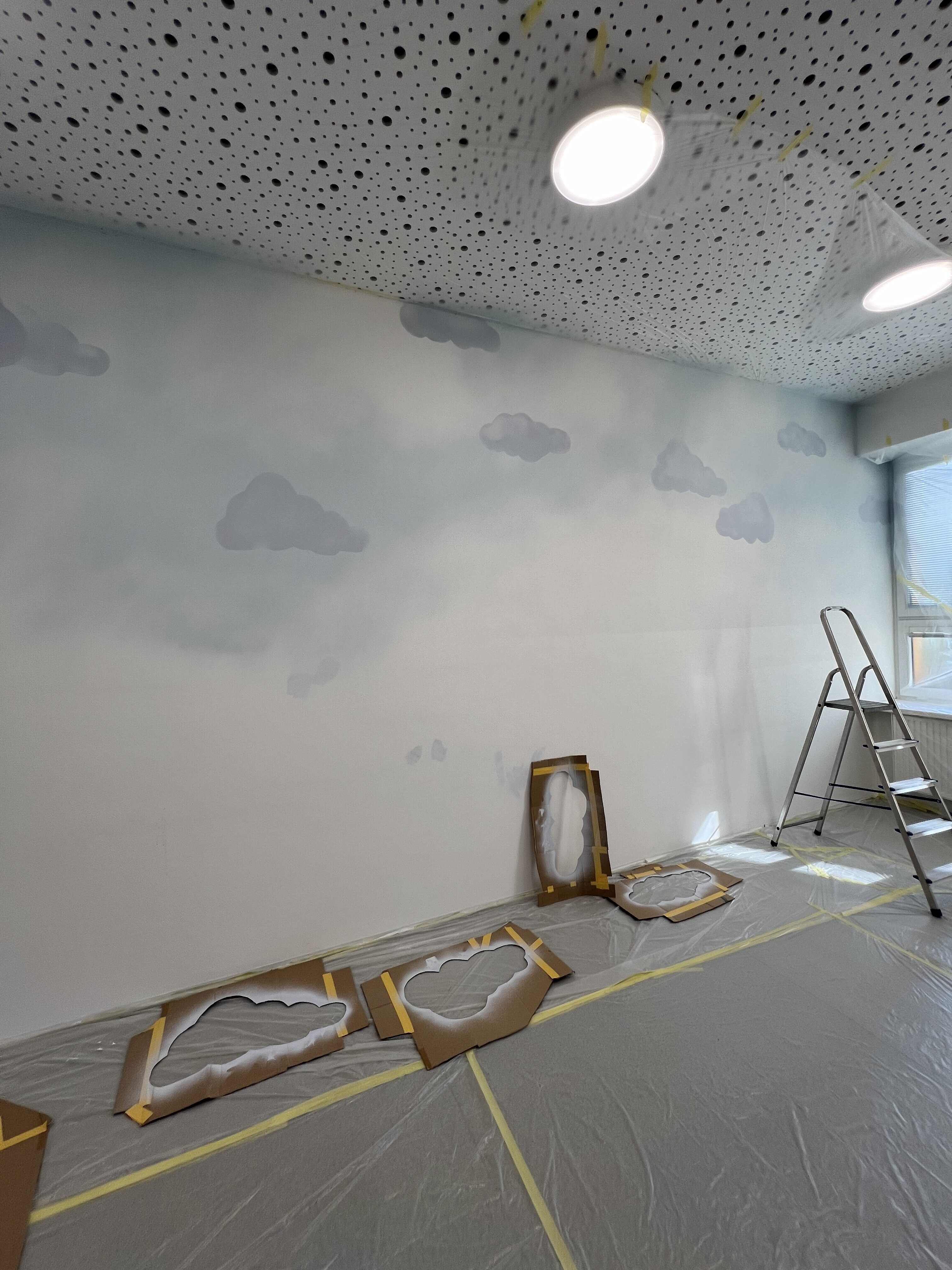 Následně můžete přejít k samotnému motivu. Předlohu si na stěnu předkreslete tužkou, abyste odhadli správné proporce. Poté se chopte štětce a pokračujte malováním jednotlivých barevných ploch. Postupujte od světlých odstínů po nejtmavší. Na závěr přejděte k tenkým linkám a detailům.