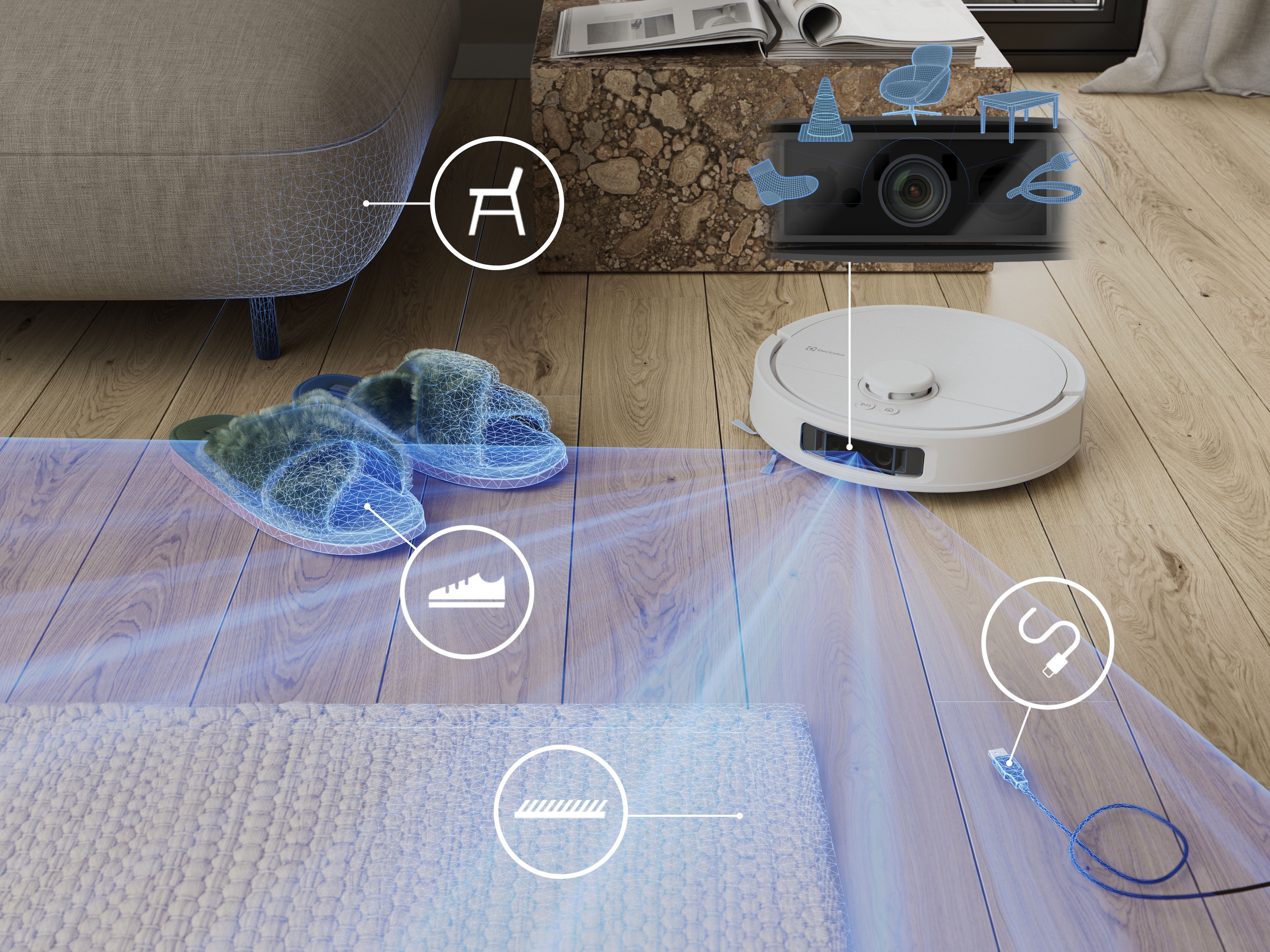 Vysavač je vybaven inteligentními technologiemi, které dělají úklid ještě jednodušší. LiDAR a Dual-Line Lazer zajišťují přesnou navigaci v prostoru, zatímco kamera s umělou inteligencí pomáhá detekovat malé i velké objekty. Díky tomu se vysavač plynule pohybuje pod nábytkem, bez problémů překoná překážky vysoké až 20 mm a nezamotá se ani do nabíjecího kabelu nebo ponožky zapomenuté na podlaze. Zařízení zároveň dokáže mapovat více podlaží v domácnosti a je vybaveno chytrými senzory, které zabraňují pádu ze schodů či jiných vyvýšených míst.