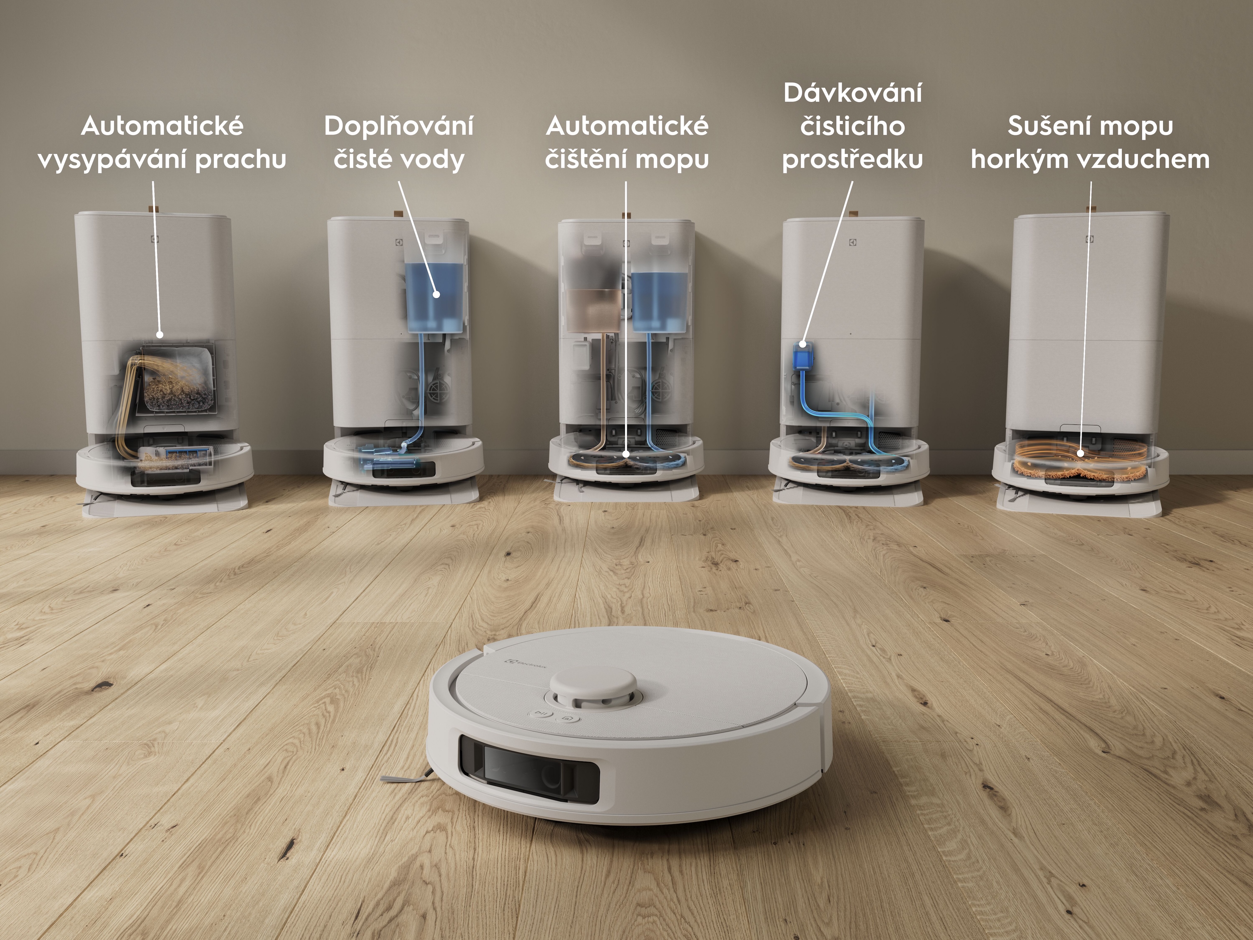 Součástí balení je také automatizovaná stanice All-in-1, která se postará o veškerou údržbu vysavače. Během úklidu stanice zajišťuje kontinuální přísun čisté vody pro mopování. Vysavač se pravidelně vrací, aby si opláchl mopovací podložky a doplnil čistou vodu, takže vytírá stále s maximálně čistými podložkami a nešíří nečistoty po podlaze. Po dokončení úklidu se vrátí do stanice, kde automaticky vysype veškerý nepořádek. Funkce ThermoWash následně mopovací podložky finálně vyčistí a vysuší horkým vzduchem, díky čemuž je vysavač vždy perfektně připraven na další úklid.
